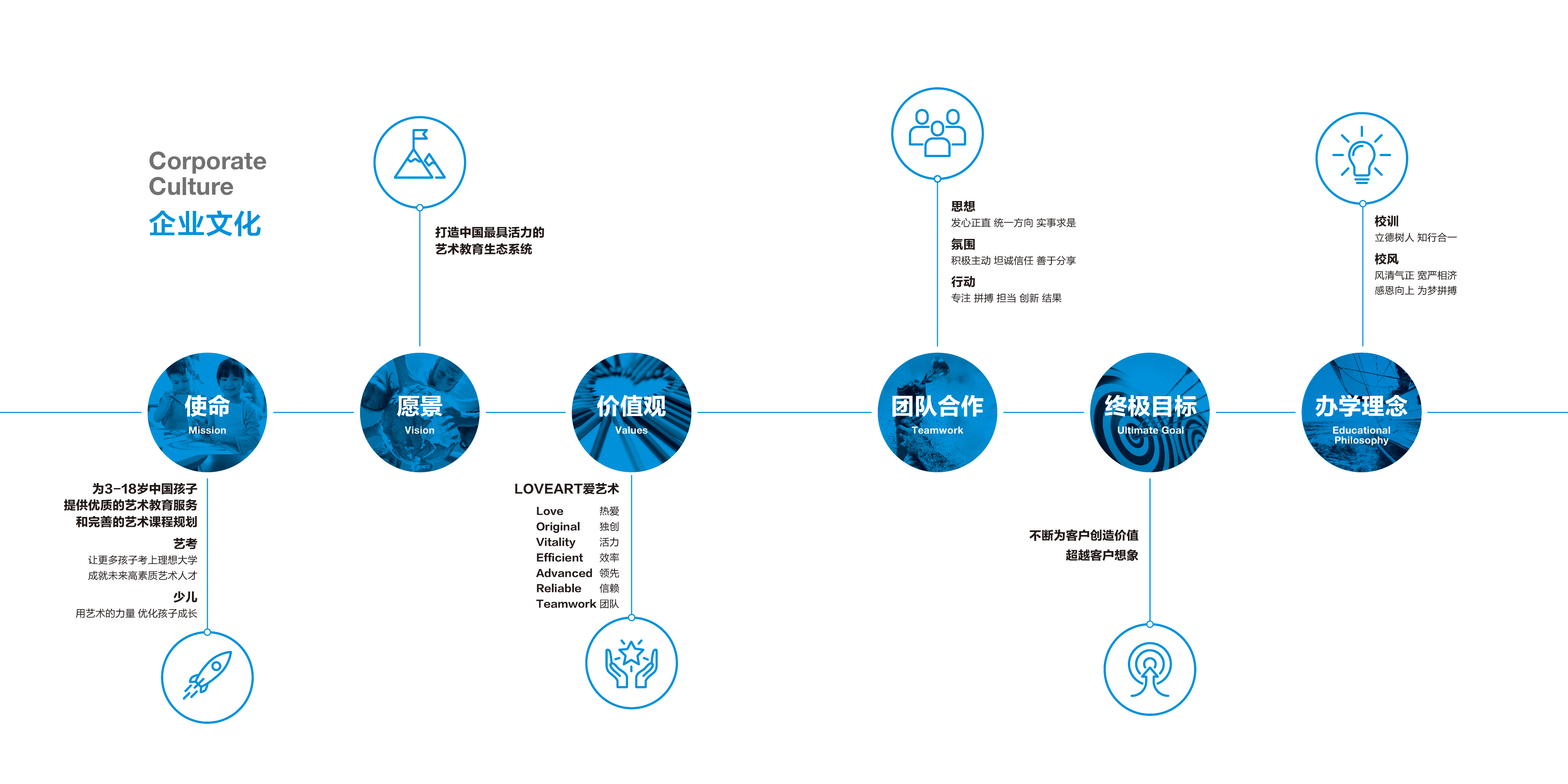 Love熱愛、Original獨(dú)創(chuàng)、Vitality活力、Efficient效率、Advanced領(lǐng)先、Reliable信賴、Teamwork團(tuán)隊(duì)